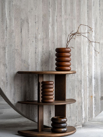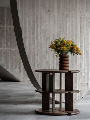 Also part of the PILAR collection is a distinctive open bookstand, designed around the elegant geometry of a half-circle. This sculptural yet functional piece offers a dynamic way to display books, magazines, or curated objects, making it both a storage solution and a statement element within an interior.